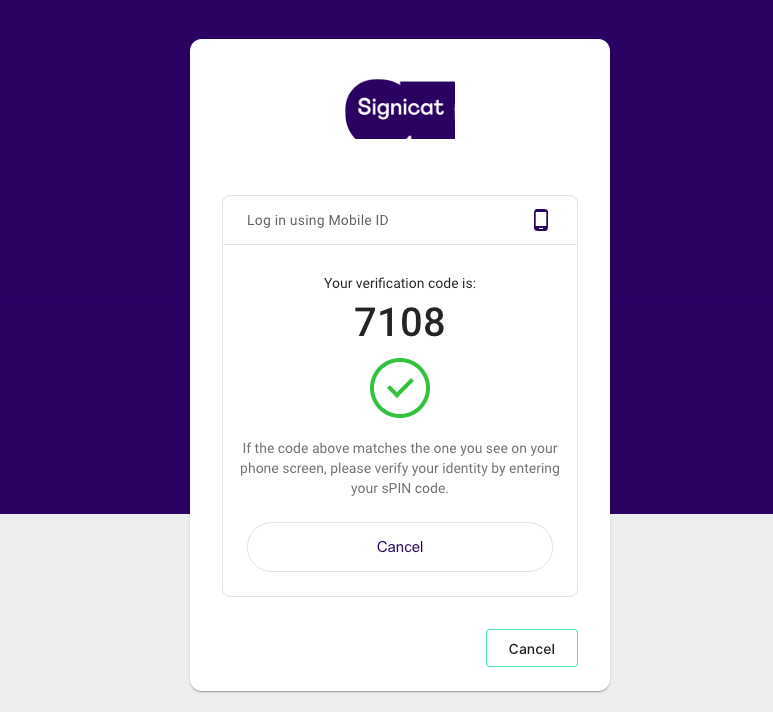 - On the mobile phone, the user enters their personal PIN code (PIN1 for authentication or PIN2 for signing) and selects OK or Send.