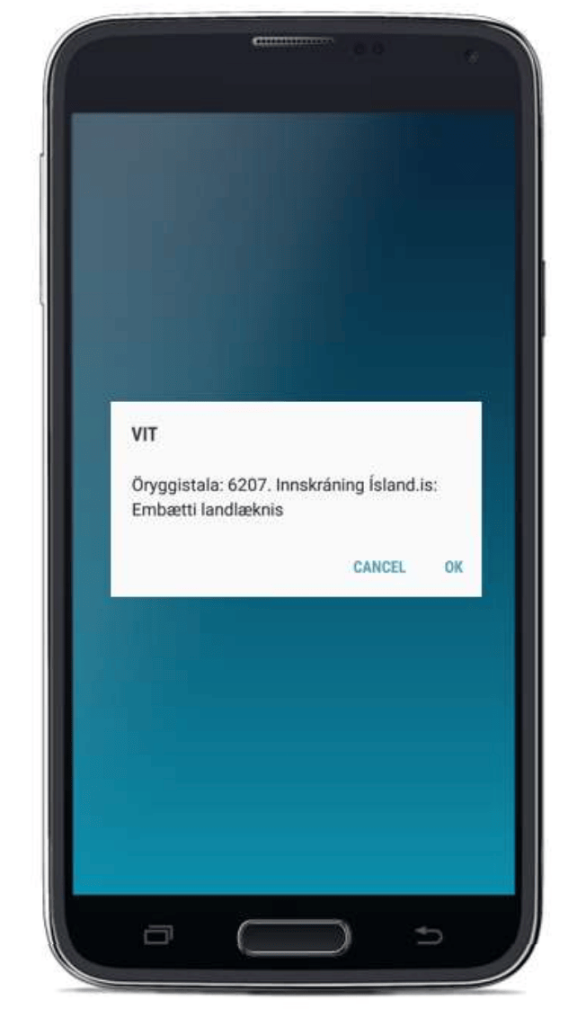 - On the mobile phone, the user receives a login SMS message with a verification code and checks that the code is the same as in the Skilríki á síma login window. If true, the user confirms by selecting OK or Accept.