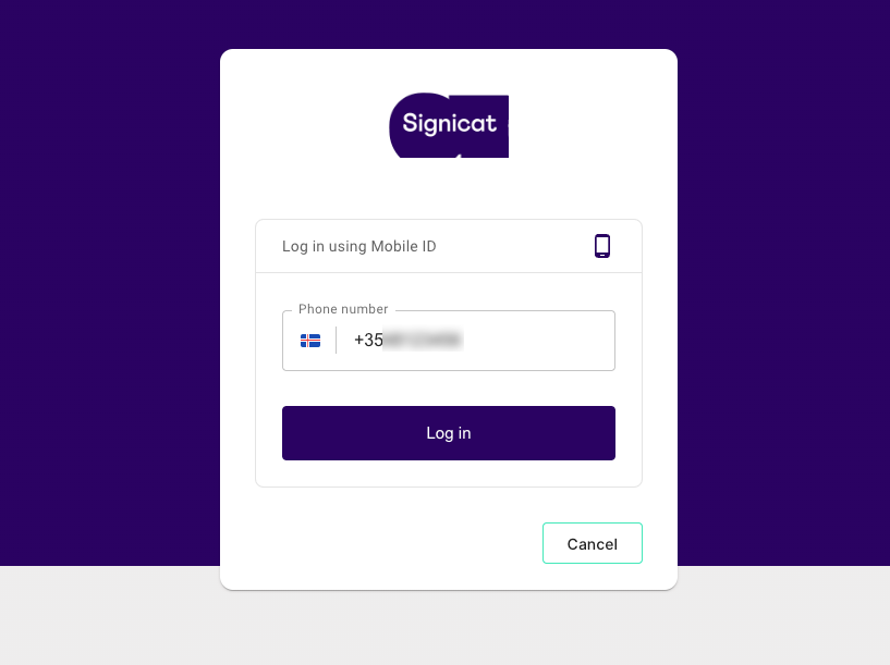 - In the login window, the user enters their mobile phone number and selects Log in (Innskrá in Icelandic).