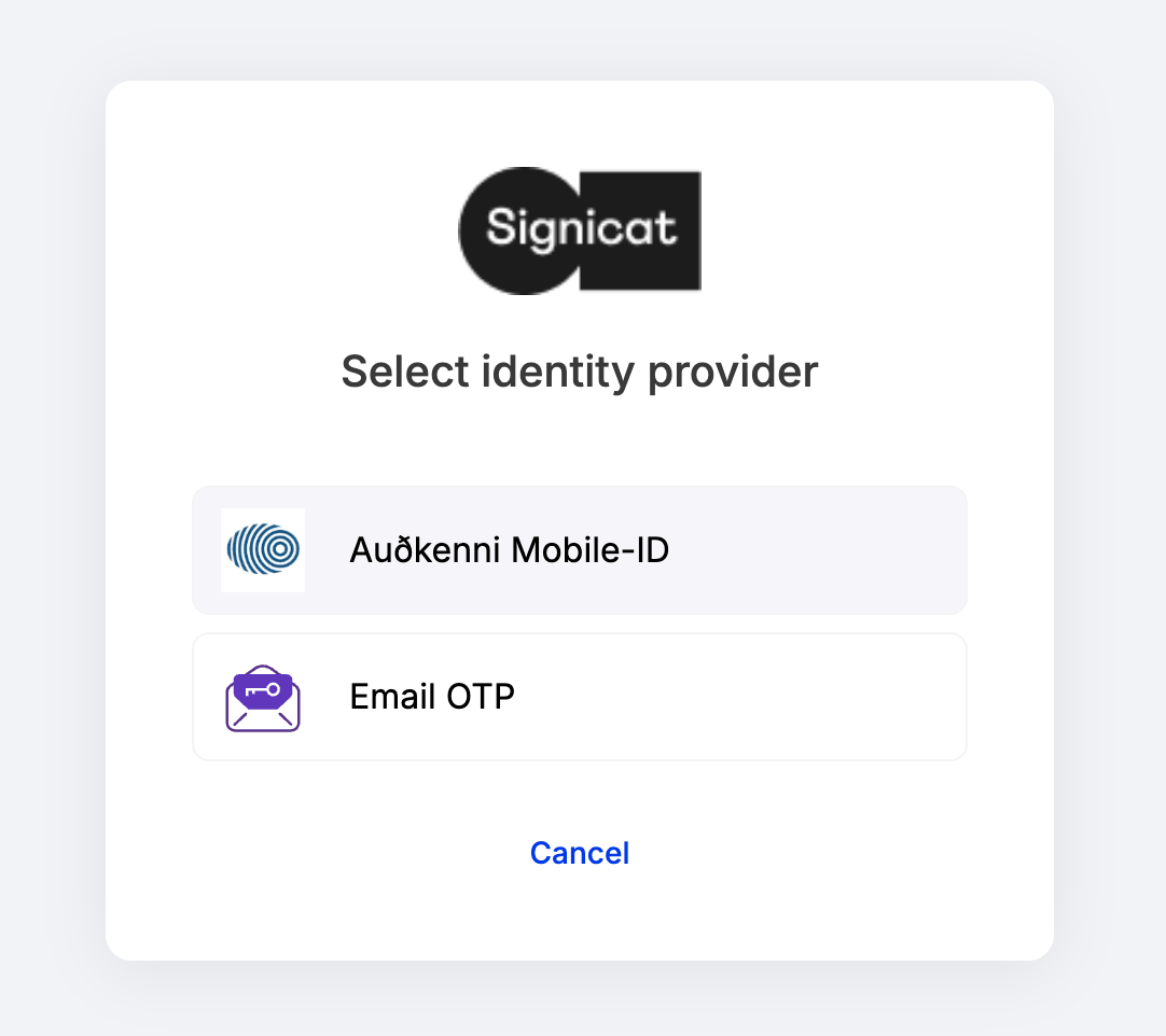 - Optional, if other eIDs are active in your account: Select Skilríki á síma from the list of identity providers.