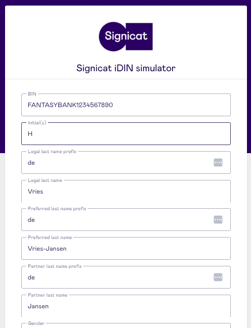 The eID simulator in the Signicat Dashboard is a tool to test authentication flows where you can edit the personal data of test users. This allows you to experiment authentication with different data properties and format.