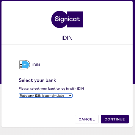 - Select "Rabobank iDIN issuer simulatie" in the dropdown menu. Then, select CONTINUE to proceed.